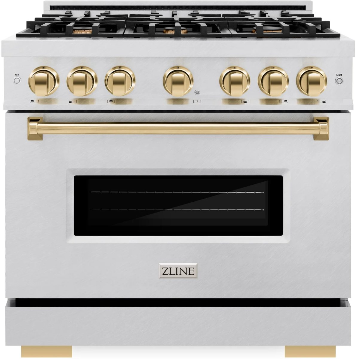 The ZLINE Autograph Edition 36 in. 5.2 cu. ft. Classic Dual Fuel Range with 6 Burner Gas Cooktop and Electric Convection Oven in Satin Stainless Steel with Polished Gold Accents (CDRSZ-36-G) combines the elegance of a hand-finished porcelain gas cooktop with 6 Italian-made auto-reignition burners, an electric convection oven with an energy-efficient cooling fan to ensure quiet operation, a Landscape oven door window design, and stunning polished gold knobs and handle allowing you to master every meal.